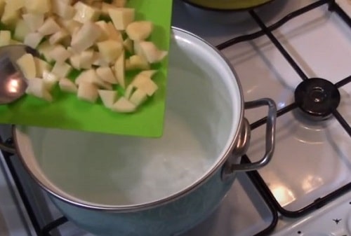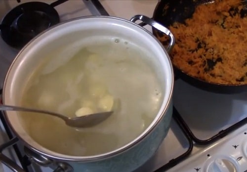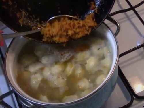 - Закип'ятіть в каструлі воду, додайте цибулю, терту моркву, гриби, картопля. Лук з морквою можна попередньо обсмажити, але в оригіналі рецепта цього немає.