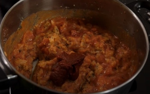 Слідом викладіть помідори у власному соку. Якщо вони цілком – порубати їх кубиками. Чи не знайдеться заповітної баночки, використовуйте свіжі томати, тільки шкірку зніміть.