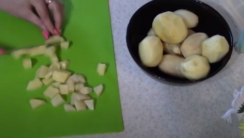 Почистіть бульби картоплі, поділіть кубиками середнього розміру.