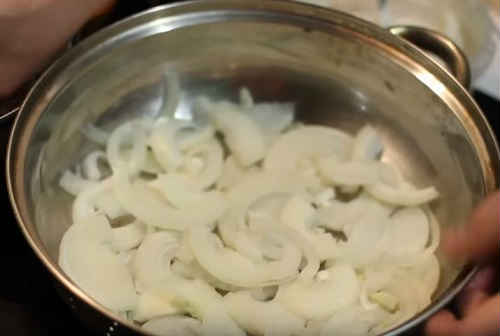 Наріжте півкільцями цибулю, викладіть подушкою в промаслений жароміцну форму.