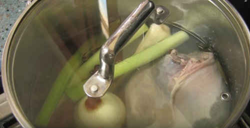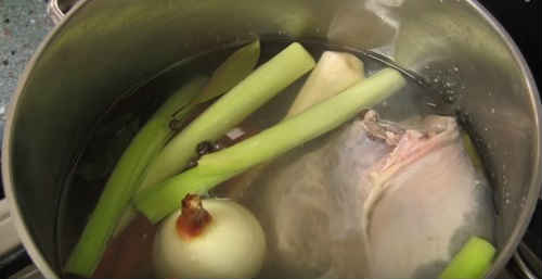 Закиньте в каструлю всі перераховані в рецепті інгредієнти. Накрийте кришкою, доведіть до закипання. Зніміть першу піну, надалі, зробіть це кілька разів.