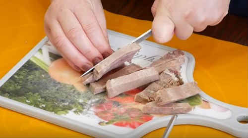 - Відваріть промитий мову. Остудіть, наріжте товстими скибочками. Бульйон не виливайте, процідіть його.