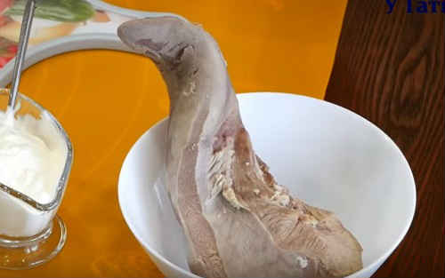 - перевірити готовність продукту легко: проткніть його ножем. Рожевий колір соку підкаже, що час варіння необхідно додати. Якщо сік прозорий, мову можна діставати і приступати до наступних етапів приготування.