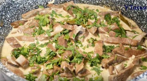 - В кінці приготування засипте рубану петрушку, порізаний часточками лимон, оливки. Протушкувати ще 5 хвилин, вимкніть конфорку.