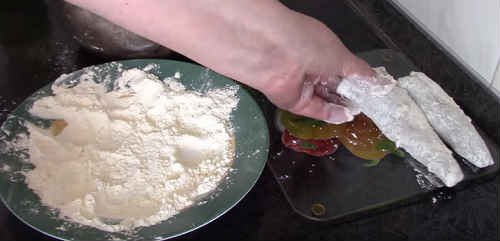 Запаніруйте мариновані заготовки борошном, гарненько обваляти з усіх боків.