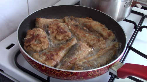 Увага! Якщо хочете знизити калорійність страви, після смаження викладіть шматочки на паперову серветку. Разом з гаком маслом підуть зайві калорії.