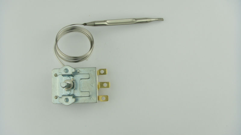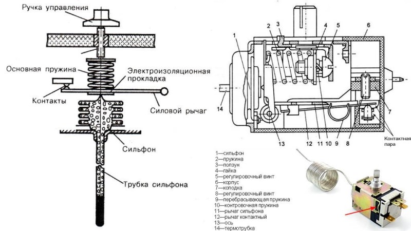 Терморегулятор являє собою механізм з важелем і контактами. Це невелика коробочка з ручкою. З одного боку у неї знаходиться сильфонне трубка, яка заповнена холодоагентом (фреоном), з іншого — контакти для підключення до електричний ланцюга (від 2 до 6 штук). Довжина герметичній трубки варіюється від 0,8 до 2,5 м. Зазвичай вона закручена в спіраль, що забезпечує щільне прилягання до стінки випарника.