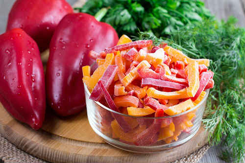 Заготівля піде на приготування овочевих гарнірів, салатів, піци, других і перших страв. Для краси, раджу робити нарізку різнокольорових перців, уявляєте, наскільки апетитно вони будуть виглядати в стравах.