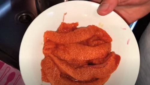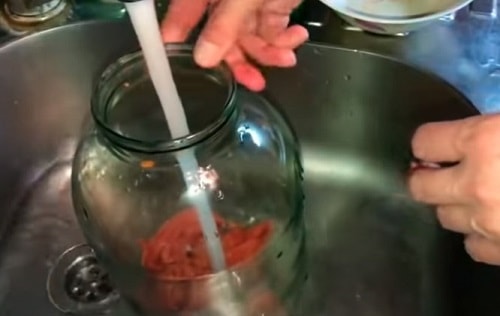 За бажанням, щоб ікринки стали чистішими можна повторити процедуру очищення ще кілька разів. Щоб якість ікри відповідало вимогам, я проробляю промивання до 10 разів. Тоді зерна стануть один до одного. Не забувайте, що заливати треба вже теплою водою.