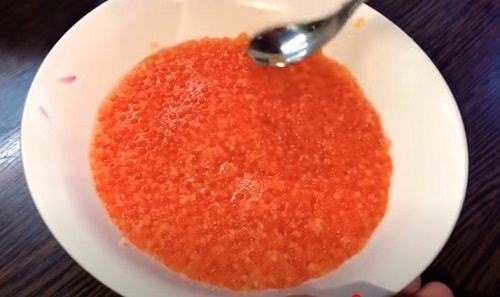 Засипте належну кількість солі з цукром. Розмішайте вміст. Ікринки відразу почнуть змінювати колір на більш насичений і красивий. Не лякайтеся, це нормальне явище. Залиште заготовку на кухонному столі при кімнатній температурі рівно на годину.