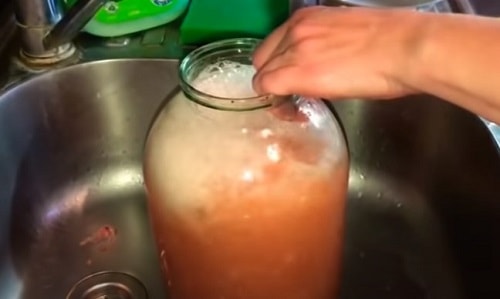 Наповніть банку теплою водою доверху, затока під сильним напором рідини. Незабаром зерна осядуть, оскільки ікринки важче води. Зате спливуть залишки плівки.
