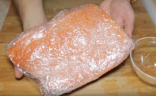 Щільно загорніть шматок в плівку, щоб не залишилося отворів. Потримайте заготівлю пару годин на столі при кімнатній температурі, потім поставте в холод на 20-24 години. Через добу розгорніть, наріжте і насолоджуйтеся.