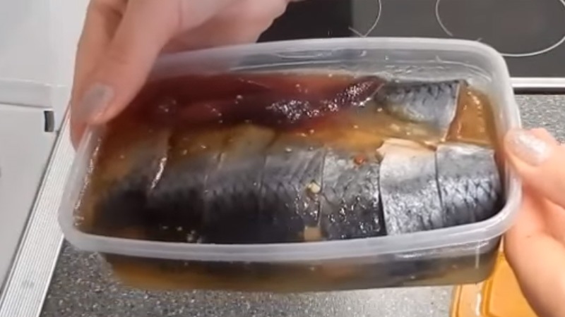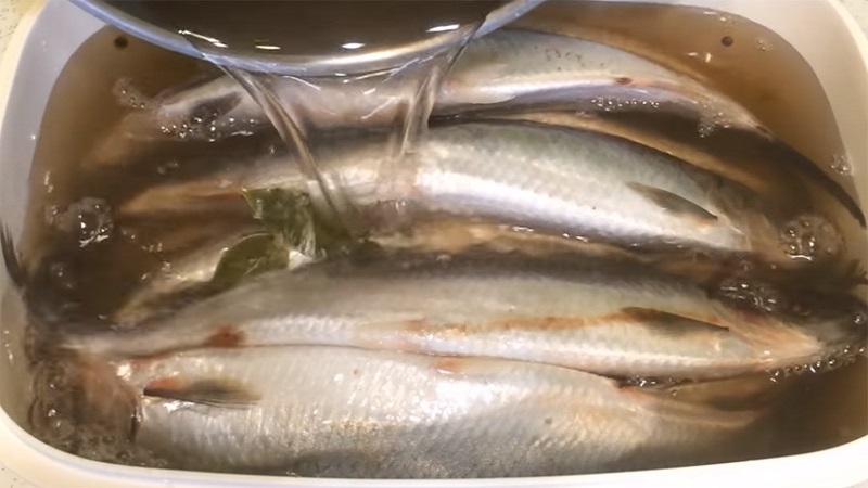 Розчин доводять до кипіння, охолоджують і переливають в ємність з рибою.