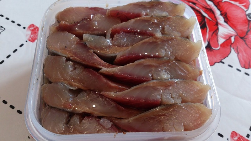 Попередньо оселедець потрошать, очищають і нарізають невеликими шматочками. У ємність для зберігання її укладають максимально щільно.