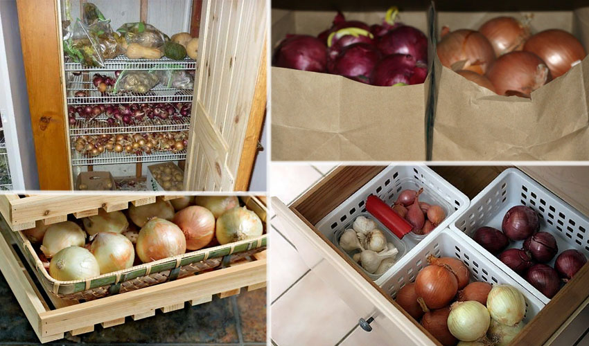 Містять цибулю в дерев’яних або пластикових ящиках, невеликих за обсягом поліпропіленових сітках або полотняних мішках. Метод зберігання в панчохах зручний і практичний. Любителі декору заплітають цибульні коси, викликають ностальгію за літнім дням.