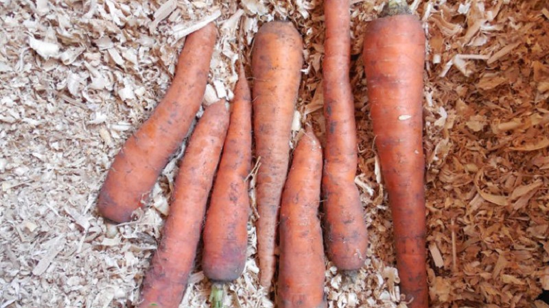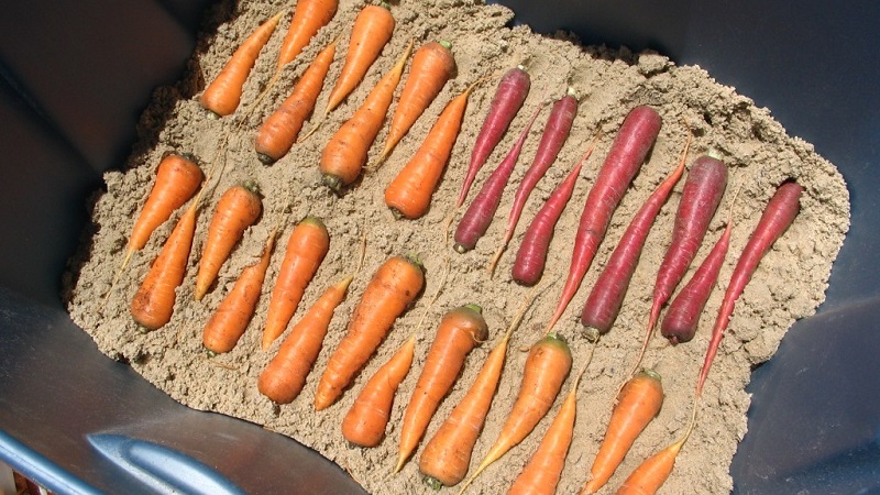 У дерев’яний ящик насипають тирсу на 1-2 см і розкладають коренеплоди, щоб вони не торкалися один одного. Зверху насипають тирсу, щоб приховати овочі, і далі поміщають новий шар моркви. Укладають шарами скриньку до верху і накривають.