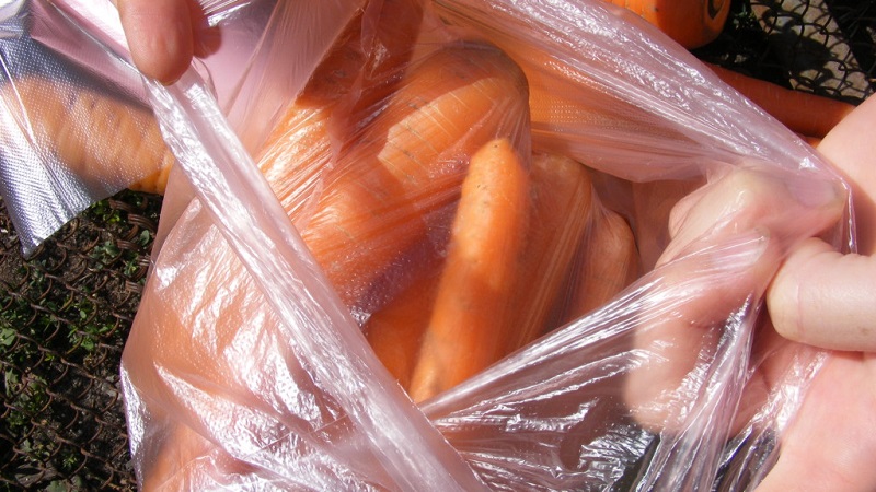 Відкривають пакети, щоб не було надлишку вуглекислого газу, який виділяє морква при зберіганні. У щільно закритих пакетах плоди загнивають.