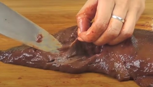Приготування починається з підготовки основного продукту. Уважно розгляньте шматок, видаліть всі судини, вони, як правило, не проварюються і погано жуются. При бажанні можна зняти верхню тонку плівку, але це не обов’язкова умова для приготування смачної страви.
