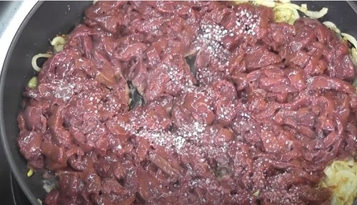 Додайте порізаний субпродукт. Підсолити блюдо, посипте перцем. Перемішайте вміст сковороди. Починайте смаження з сильного вогню.