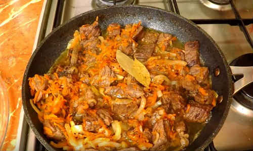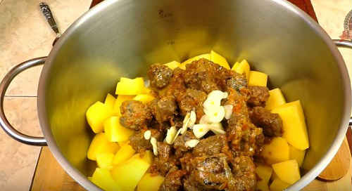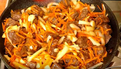 - Якщо продукти викладаються шарами, на дно кладіть той, що довше готується. У нашому випадку – це яловичина.