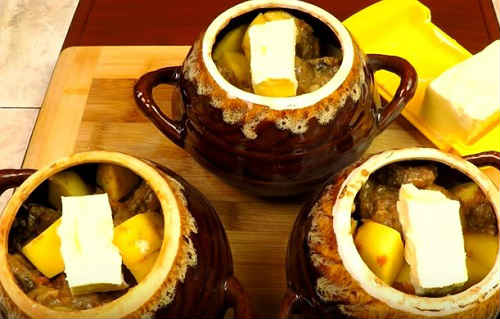 Перше, і найважливіше правило: горщики ставляться тільки в холодну духовку, і тільки потім її поступово розігрівають до необхідної температури. Тендітна глина лусне від швидкого перепаду температури, і страва буде остаточно зіпсовано. Ця помилка типова для початківців кулінарів, тому я виділяю даний рада. Якщо духовка вже розігріта, тоді доведеться будь-яким способом зігріти горщики.