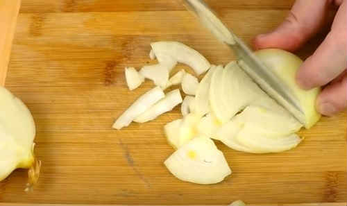 - Наріжте півкільцями цибулину. Почистіть картопляні бульби, наріжте не дуже тонкими пластинами.