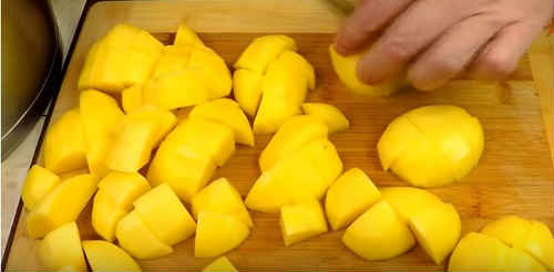 Одночасно почистіть картоплю, наріжте його великим кубиком.