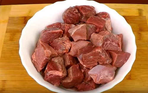 М’ясо промийте, промокніть паперовими серветками. Наріжте досить великими кубиками.