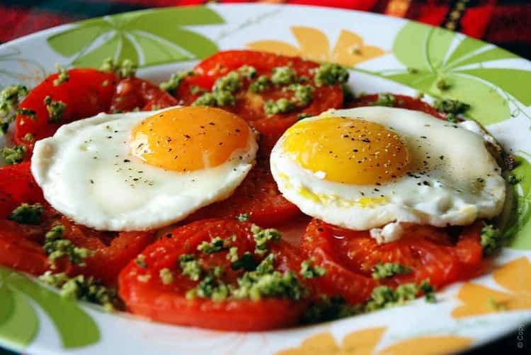 - Якщо готувати яєчню з двох яєць з додаванням солоних помідорів і цибулі, то її калорійність буде мати показник 209 кілокалорій на 100 грам.