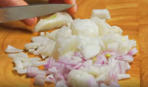 - Дістаньте цибулину, викиньте, додайте шматочки риби.