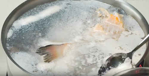 - Підготуйте рибу до варінні: видаліть з голови зябра, зчистите луску. Покладіть в каструлю, влийте воду. Поставте на плиту, дайте закипіти. Варіть приблизно 20 хвилин.