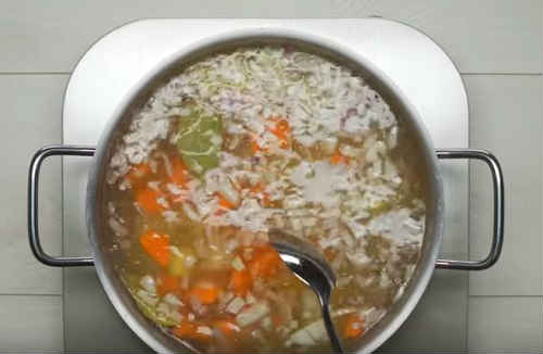 - За 10 хвилин до сигналу про закінчення варіння посоліть бульйон і засипте приправи.