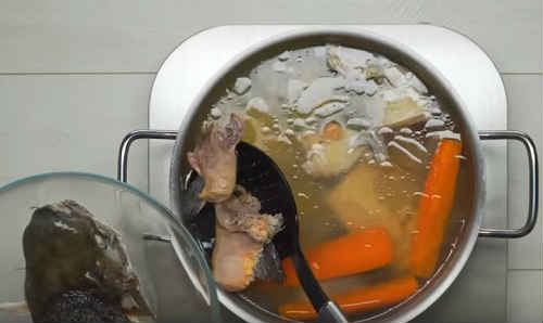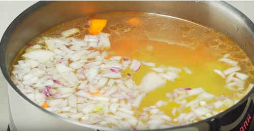 - Після закипання видаліть піну, закиньте головку цибулі і одну морквину цілком.