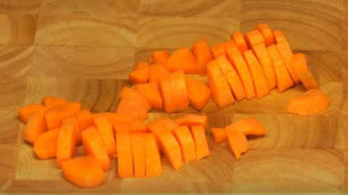 - Моркву, цибулю і картоплю поріжте кубиками довільного розміру.
