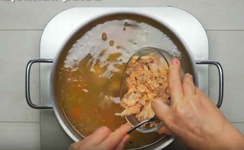 - Злийте бульйон, процідіть його, поверніть в каструлю, закладіть цибулю з морквою. Рибку розберіть на шматочки, викинувши кістки.
