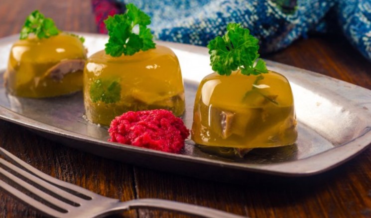 Кількість бульйону можна додати за смаком. Комусь подобається велика кількість желе, адже воно з смачного наваристого бульйону, а хтось просто елегантно проходиться пензликом з бульйоном з м’яса, лише злегка відтіняючи його ніжну фактуру пружним желе.