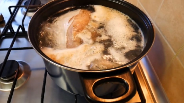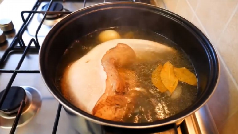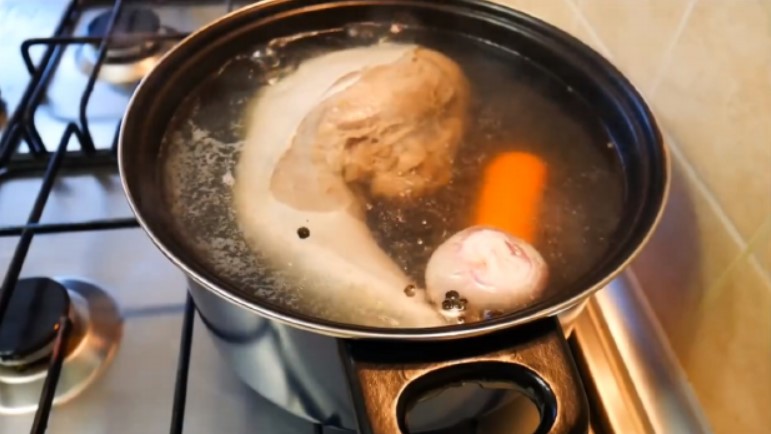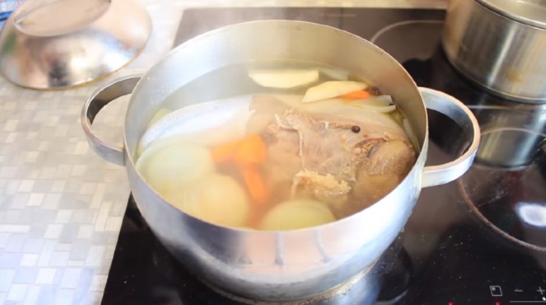 Щоб желе вийшло смачним і ароматним, в другу воду закладають трави і овочі, які потім можна використовувати, а можна викинути.