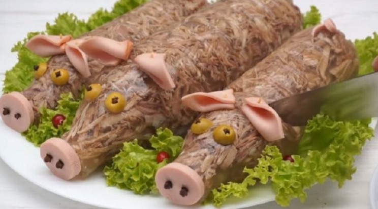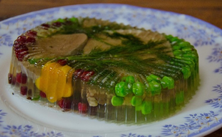 Історично так склалося, що новорічний стіл традиційно збирається з страв саме радянської кухні: олів’є, оселедець під шубою, м’ясо по-французьки або запечений гусак. Заливне з язика теж має стандартний для радянської кухні варіант подачі. Його і приготуємо до Нового року.