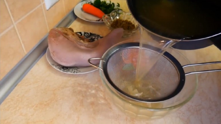 Класичний холодець передбачає щільне прояснена желе. У випадку з м’ясним бульйоном достатньо його просто процідити. Кількість желатину збільшується в півтора-два рази порівняно з нормою (з тією пропорцією, що вказана на упаковці конкретного виробника).