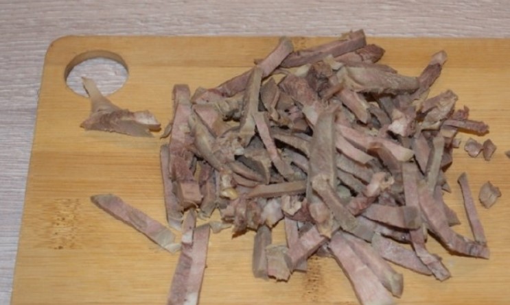 Порізати дрібно. Можна змішати з смако-ароматичними топпінг: горошком, вареною морквою, маслинами. А можна використовувати тільки м’ясо.