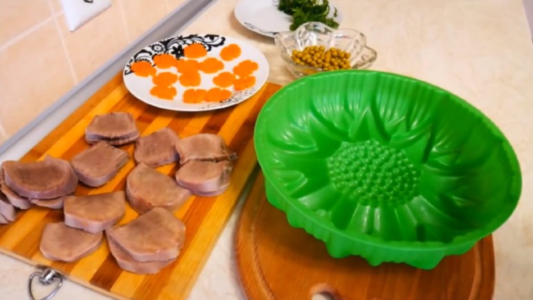 5. Язик почистити, порізати і почати збірку холодцю. Морква з допомогою формочок для канапе порізати квіточками. Якщо немає формочок, красу можна зробити наступним чином: на цілій вареної моркви прорізати поздовжні борозенки по 4-5 лініях, потім порізати її скибочками. Вийдуть теж симпатичні квіточки.