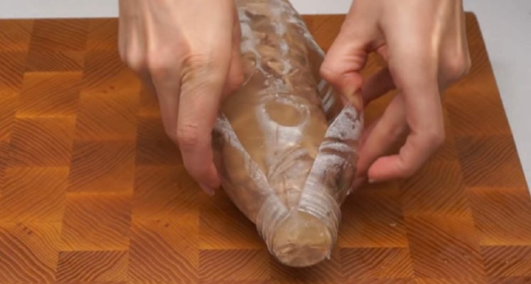 У пляшку з-під мінеральної води (з тонкого пластику) через шийку помістити м’ясо. Залити бульйоном і відправити в холодильник. Коли желе повністю охолоне, пляшку треба обережно розрізати і зняти.