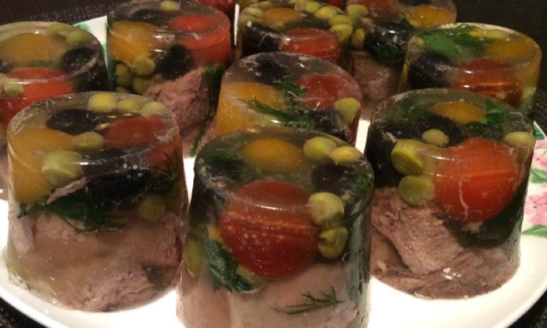 У формочки викласти маслинки, по одному помідора, трохи зелені і м’ясо. Залити бульйоном. Поставити в холодильник перед подачею перекласти його на блюдо.