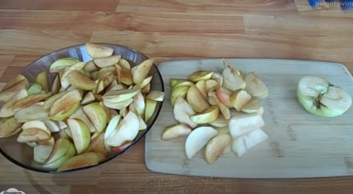 Тепер займіться яблуками. Обполосніть фрукти, розділіть на половинки. Видаліть серединну частина з насінням. Наріжте тонкими скибочками.