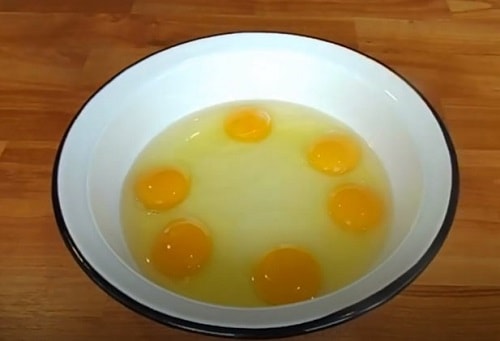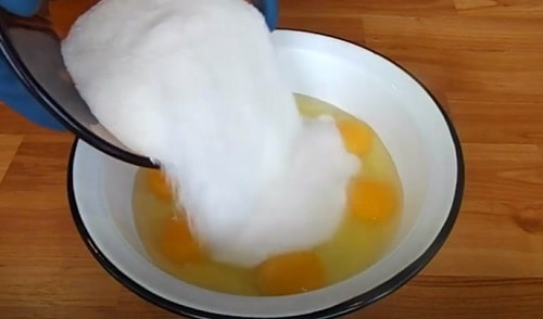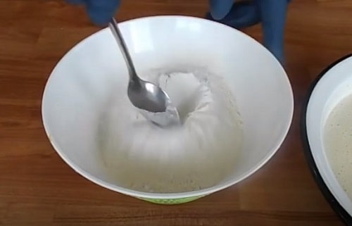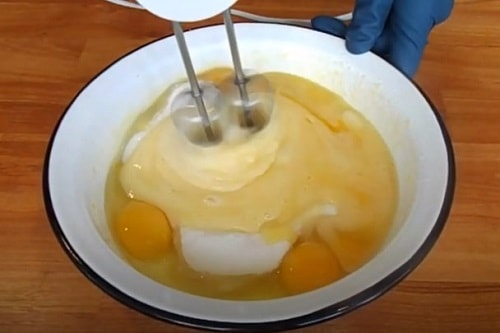 Перекладіть борошняну суміш до збитих яєць. Знову пробийте міксером, замісивши рідке тісто. Якщо робите заміс віночком, то борошно засинайте невеликими порціями, щоб вимішувати було легше (прослідкуйте, щоб розбилися всі грудочки).