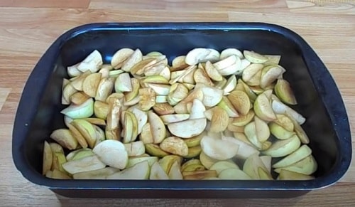 Промажьте форму для випікання будь-яким маслом, викладіть яблучні дольки. Розрівняйте, щоб вони лягли в один-два шари.