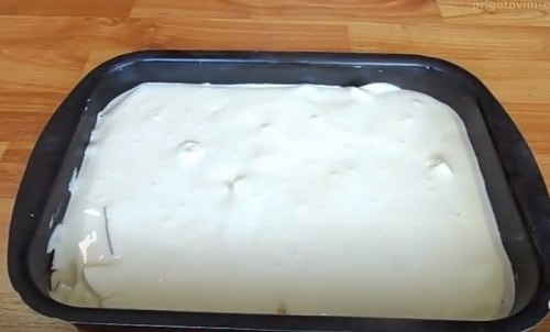 Залийте нарізку рідким тестом. Знову розрівняйте, або потрясіть форму, щоб воно вляглося.