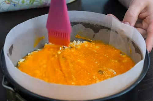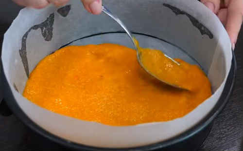 Постеліть на дно пекарську папір, вистеліть боковини. Гарбузове пюре візуально поділіть на дві частини. Одну з них вилийте на дно форми.