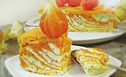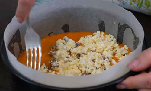 Накрийте шаром сирної начинки. Якщо залишилося ще трохи гарбуза і начинки, зробіть ще один шар. Верхній шар – сирний.