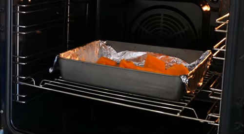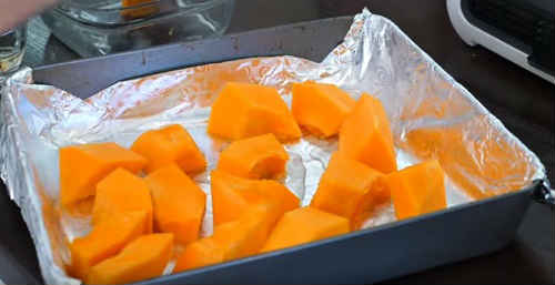 Почніть з запікання гарбуза. Наріжте овочі шматочками, вирізати насінну частину, зніміть шкірку. Підстеліть на деко фольгу або пекарську папір. Викладіть шматочки, влийте трохи води.